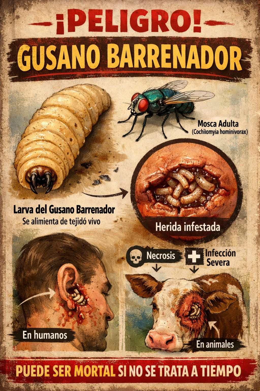 La presencia del gusano barrenador representa un riesgo sanitario serio para la ganadería y la salud pública, especialmente durante temporadas de calor y humedad, cuando su reproducción se intensifica. Esta plaga, conocida científicamente como Cochliomyia hominivorax, invade heridas abiertas y se alimenta de tejido vivo, lo que puede provocar infecciones graves, pérdida de peso, disminución en la producción pecuaria e incluso la muerte de los animales afectados.