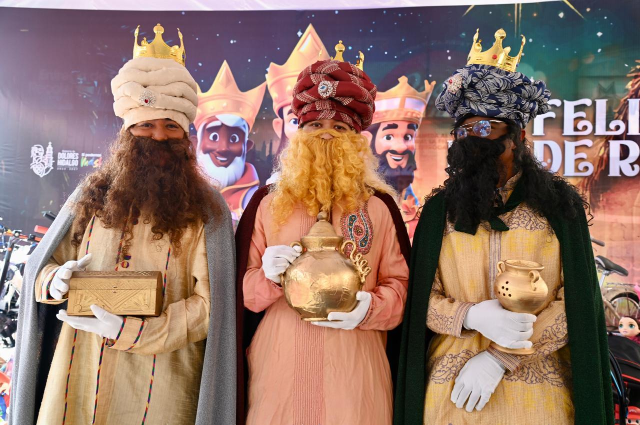 Melchor, Gaspar y Baltazar llegaron al centro histórico de Dolores Hidalgo Cuna de la Independencia Nacional para regalar cientos de juguetes a los niños, niñas y jóvenes que se dieron cita.