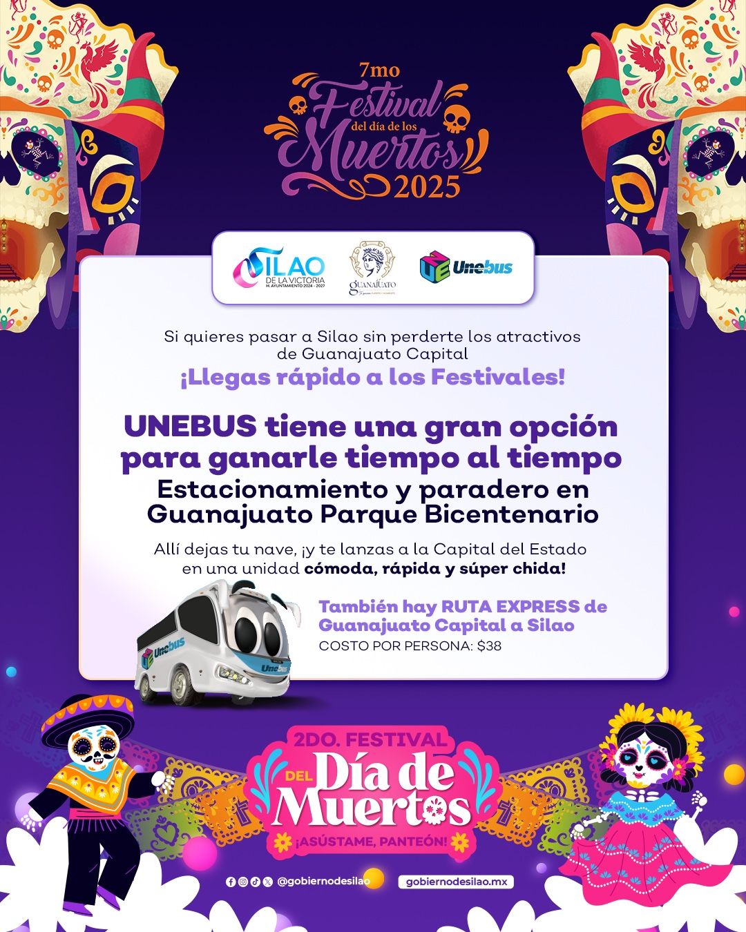 Para disfrutar de las festividades del Día de Muertos sin prisas ni contratiempos, la línea de transporte UNEBUS implementó una ruta especial que conectará al Parque Guanajuato Bicentenario con Silao y Guanajuato Capital durante los Festivales del Día de Muertos de ambas ciudades.