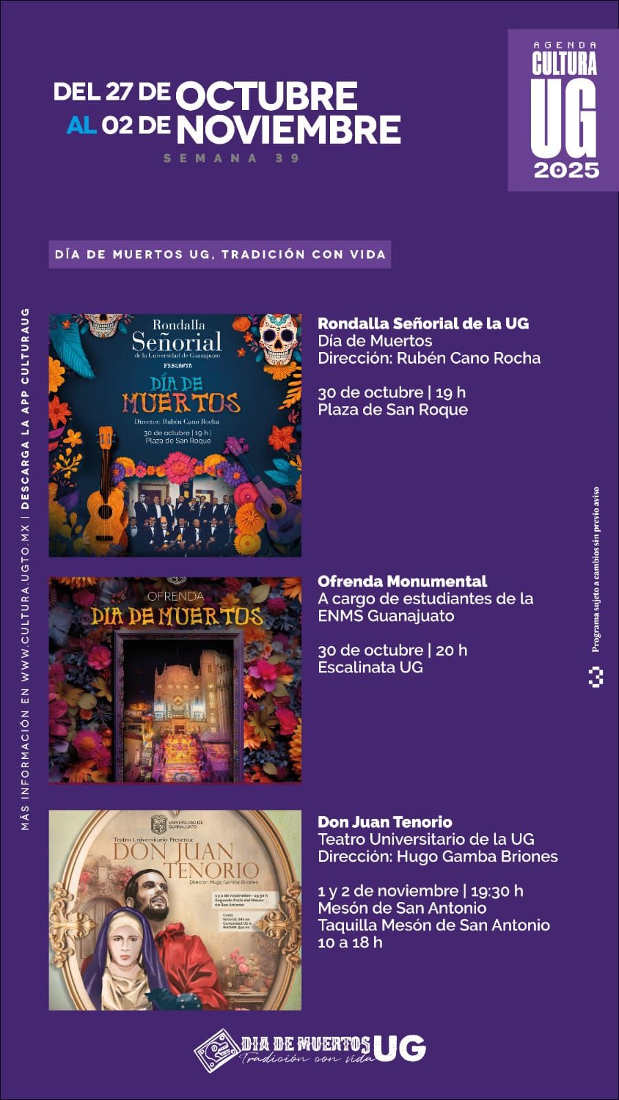 La Universidad de Guanajuato (UG) celebrará una de las tradiciones más emblemáticas del país con una extensa programación cultural abierta al público bajo el lema “Día de Muertos UG, Tradición con vida”.